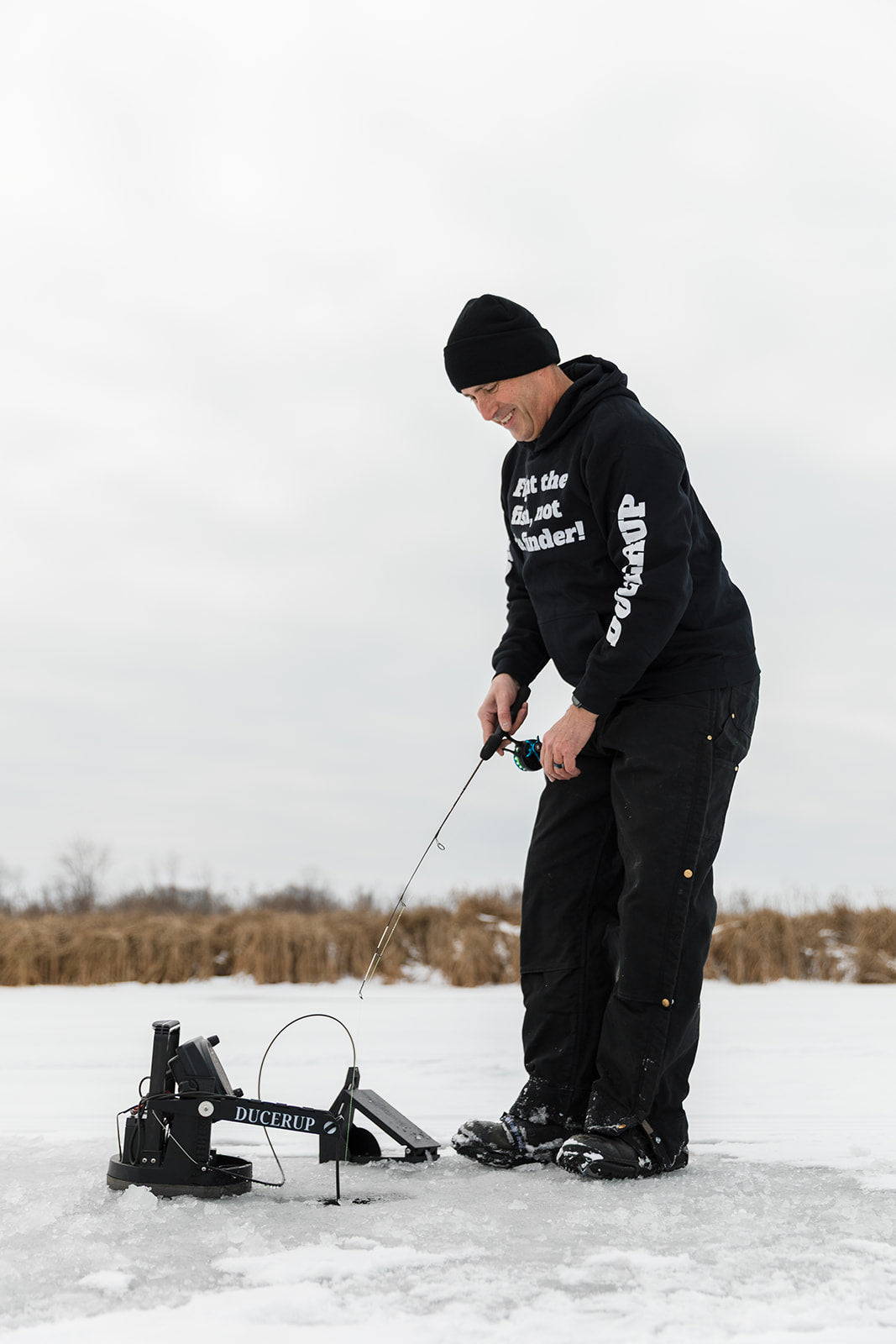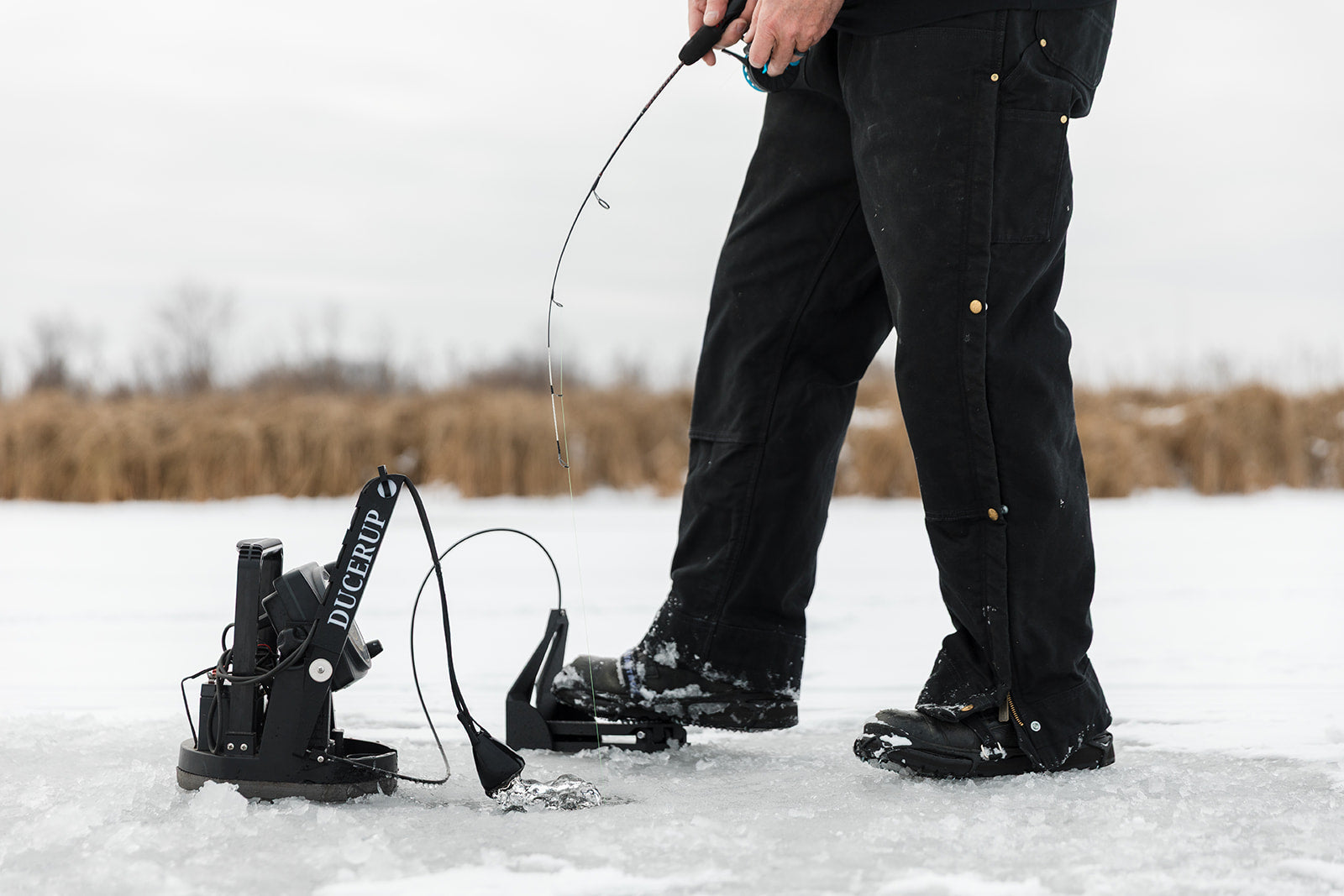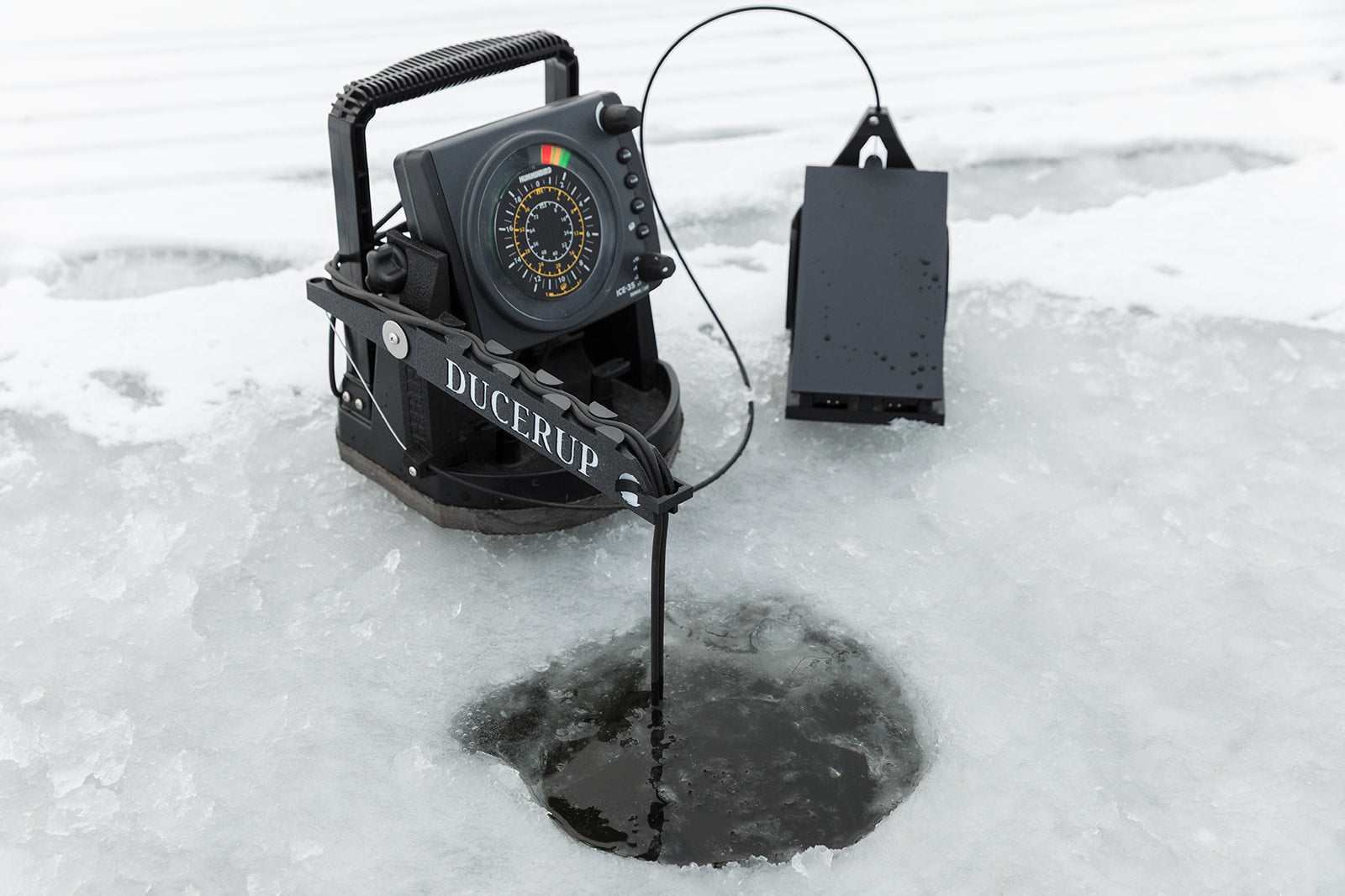 DUCERUP® is a patented lever arm assembly that lifts the transducer out of the hole when you press the pedal with your foot. This keeps your hands on the rod where you can focus on maintaining pressure on the fish. No longer do you have to bend over, leave your seat, or ask a friend to pull the transducer out of the hole when you have "the big one" on your line. DUCERUP® is available for a wide variety of platforms from all the major manufacturers of ice fishing electronics.